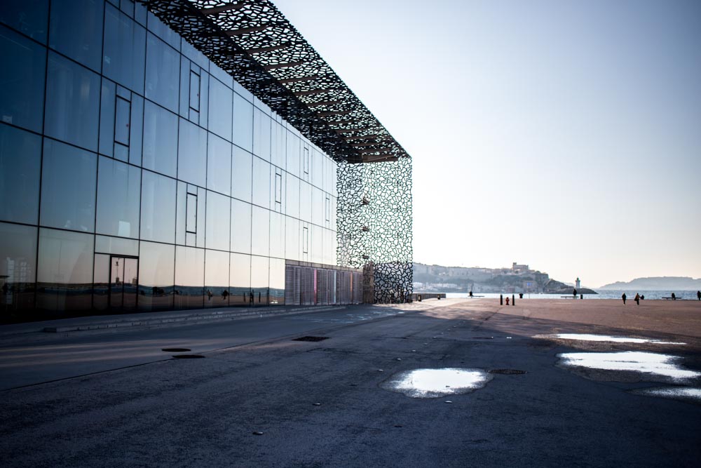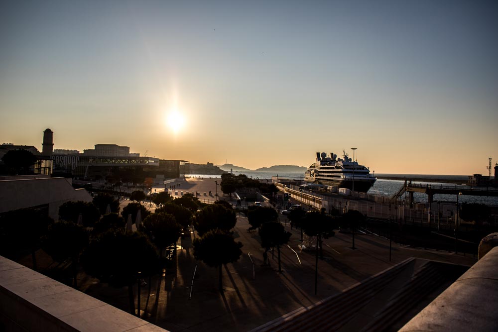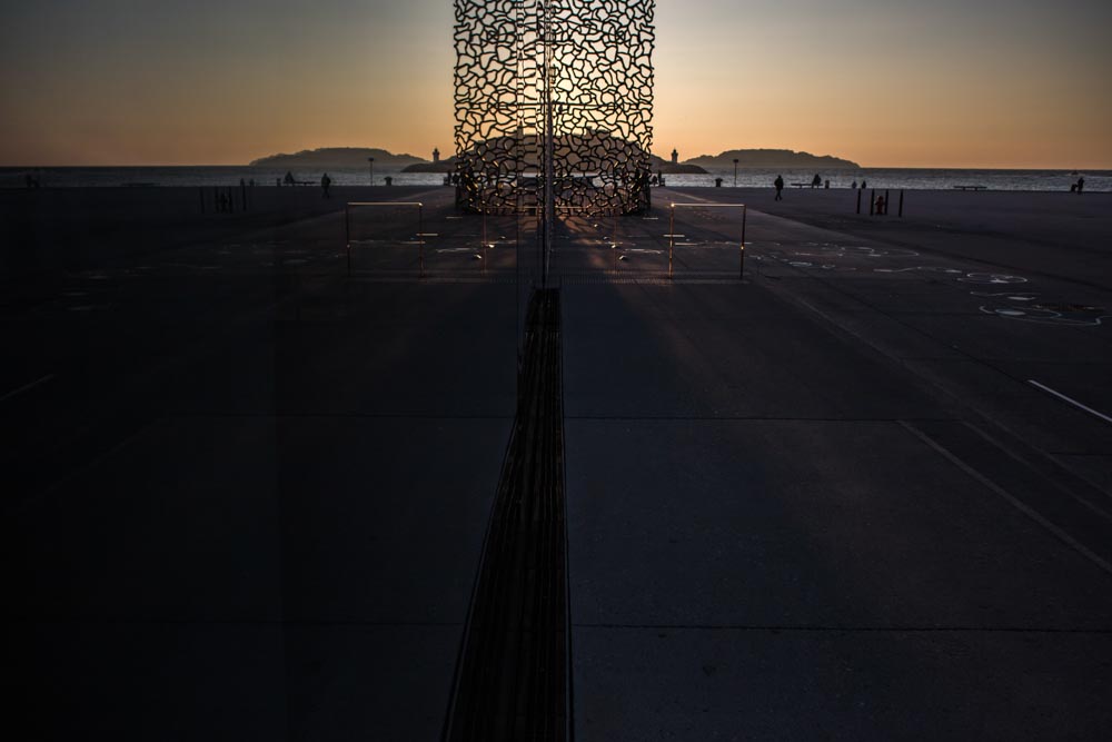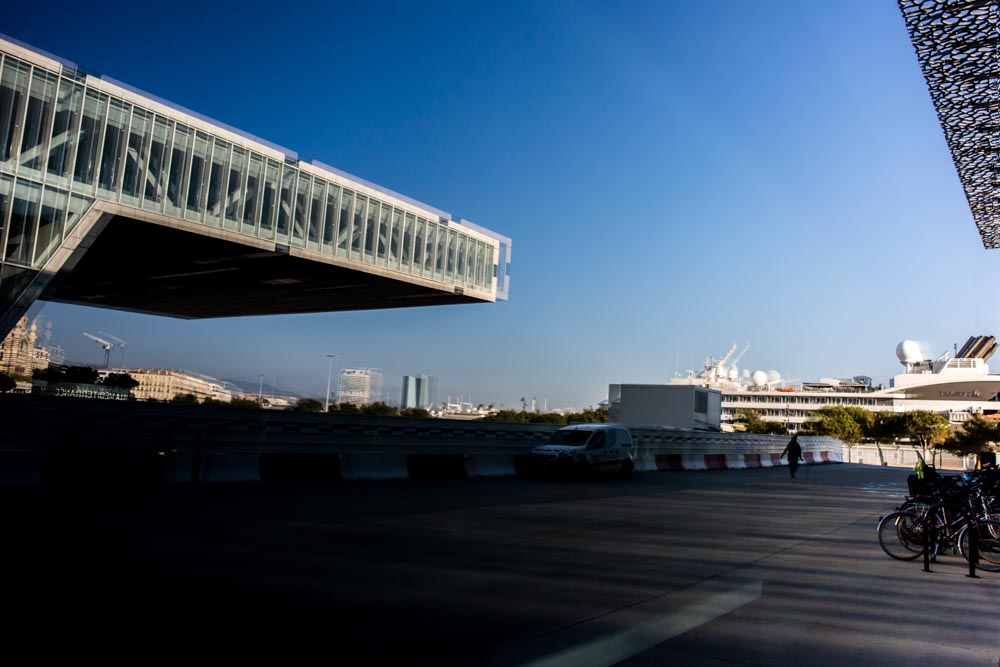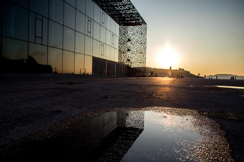 Le musée du Mucem, même si fermé en ce moment à cause de la COVID 19, est un lieu toujours vivant. Les promeneurs en font le tour et viennent admirer le coucher de soleil en bord de mer. Les sportifs font leur footing ou leur sortie à vélo. Les jeunes viennent s’asseoir au bord du quai.