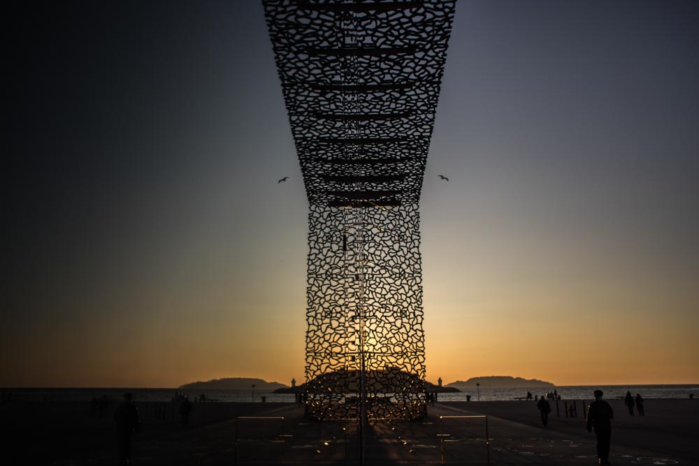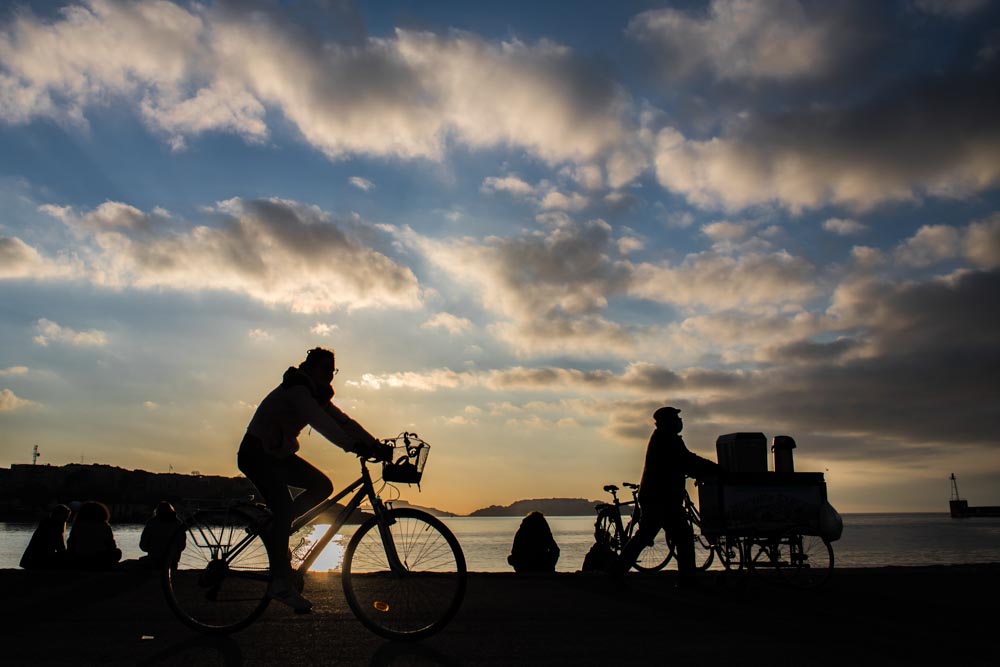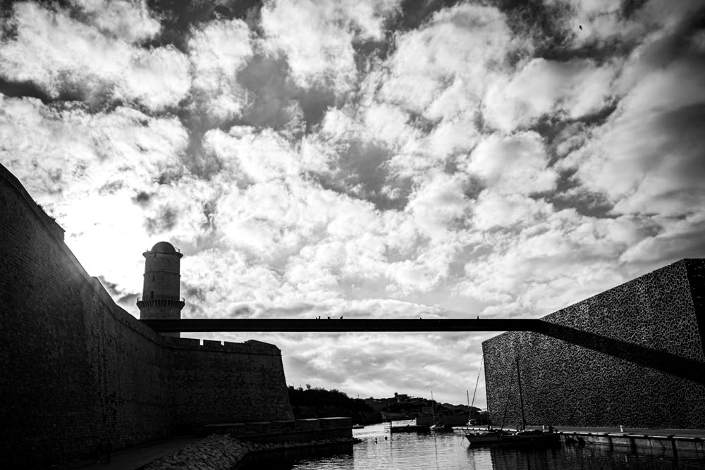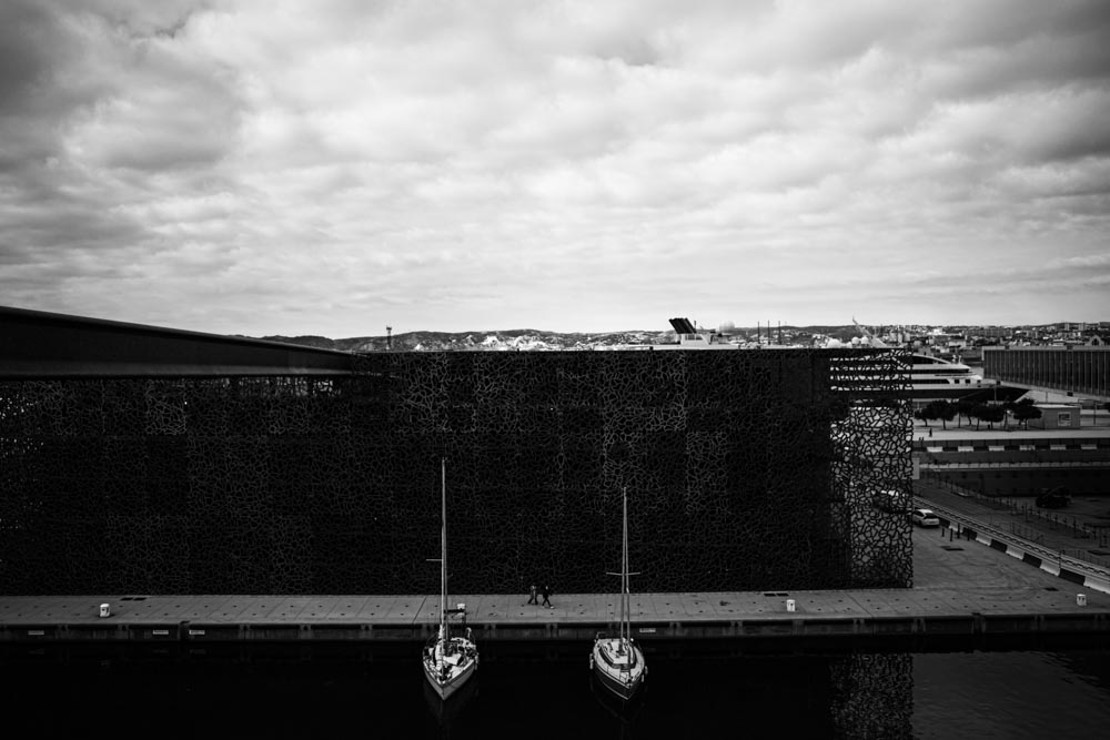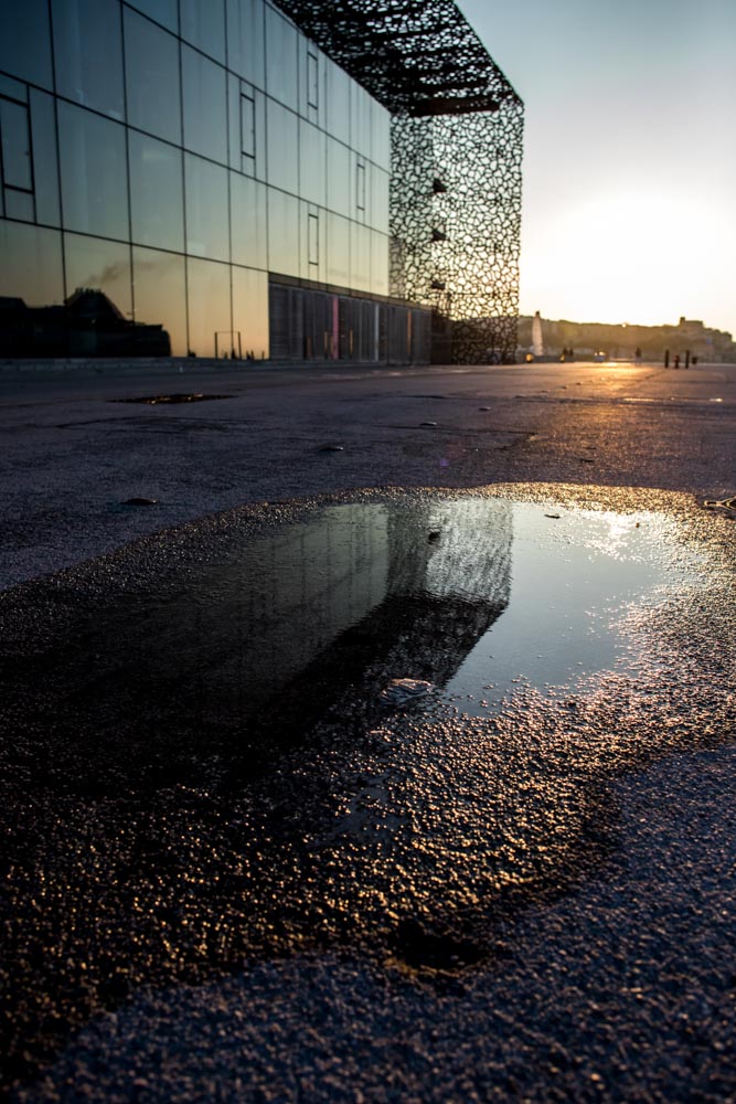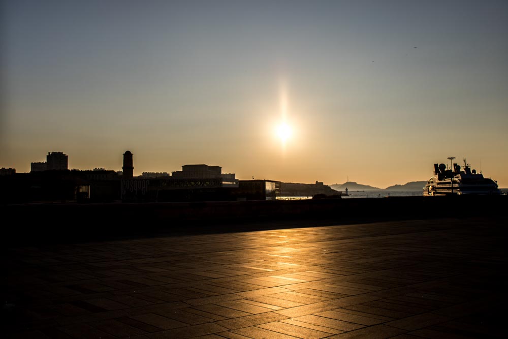 Le musée du Mucem, même si fermé en ce moment à cause de la COVID 19, est un lieu toujours vivant. Les promeneurs en font le tour et viennent admirer le coucher de soleil en bord de mer. Les sportifs font leur footing ou leur sortie à vélo. Les jeunes viennent s’asseoir au bord du quai.