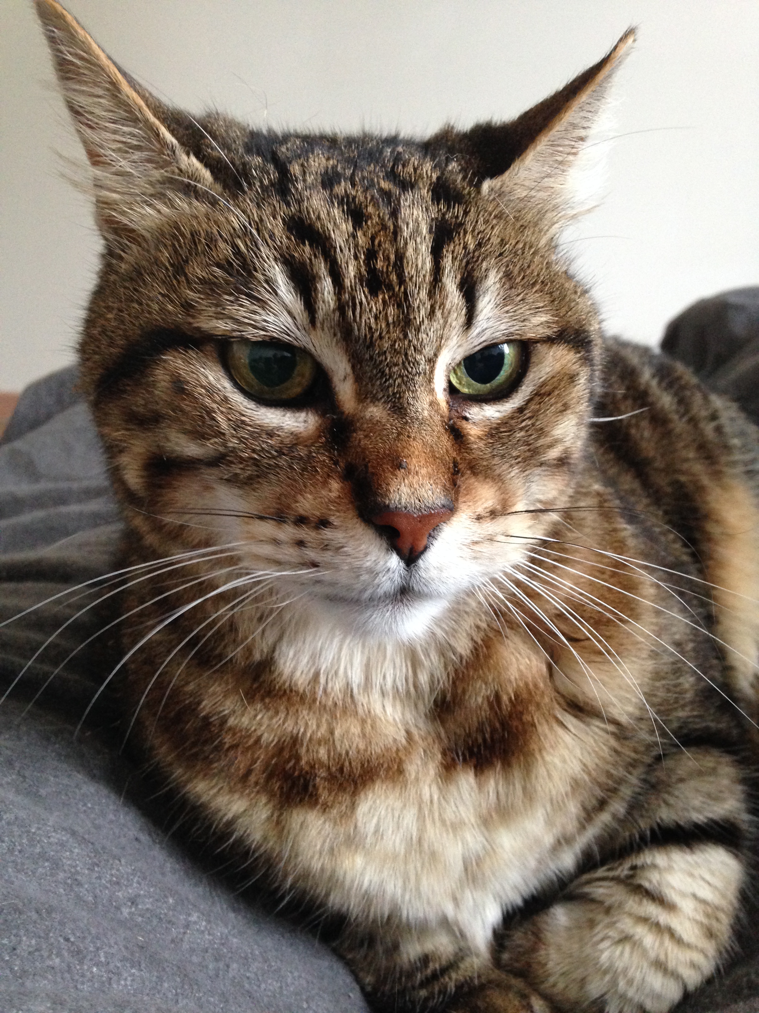 Trouvé dans la rue et n’ayant plus de maman, j’étais tout petit et très maigre à mon arrivée dans ma maison. Chasseur né, au grand désespoir de ma maman qui est végétarienne. Tout y passe, des petits papillons aux belles ailes si fragiles, aux petits oiseaux que j’expose fièrement au milieu du salon après en avoir mangé une bonne partie, aux plus gros oiseaux que je vais cacher, sans oublier les petits lézards, geckos, petites souris que ma maman essaie de sauver… en me courant après, mais j’accepte de lui montrer lorsqu’elle me félicite. Je suis le chat le plus indépendant de la famille. Je sors beaucoup et rentre pour me reposer et faire des câlins.
